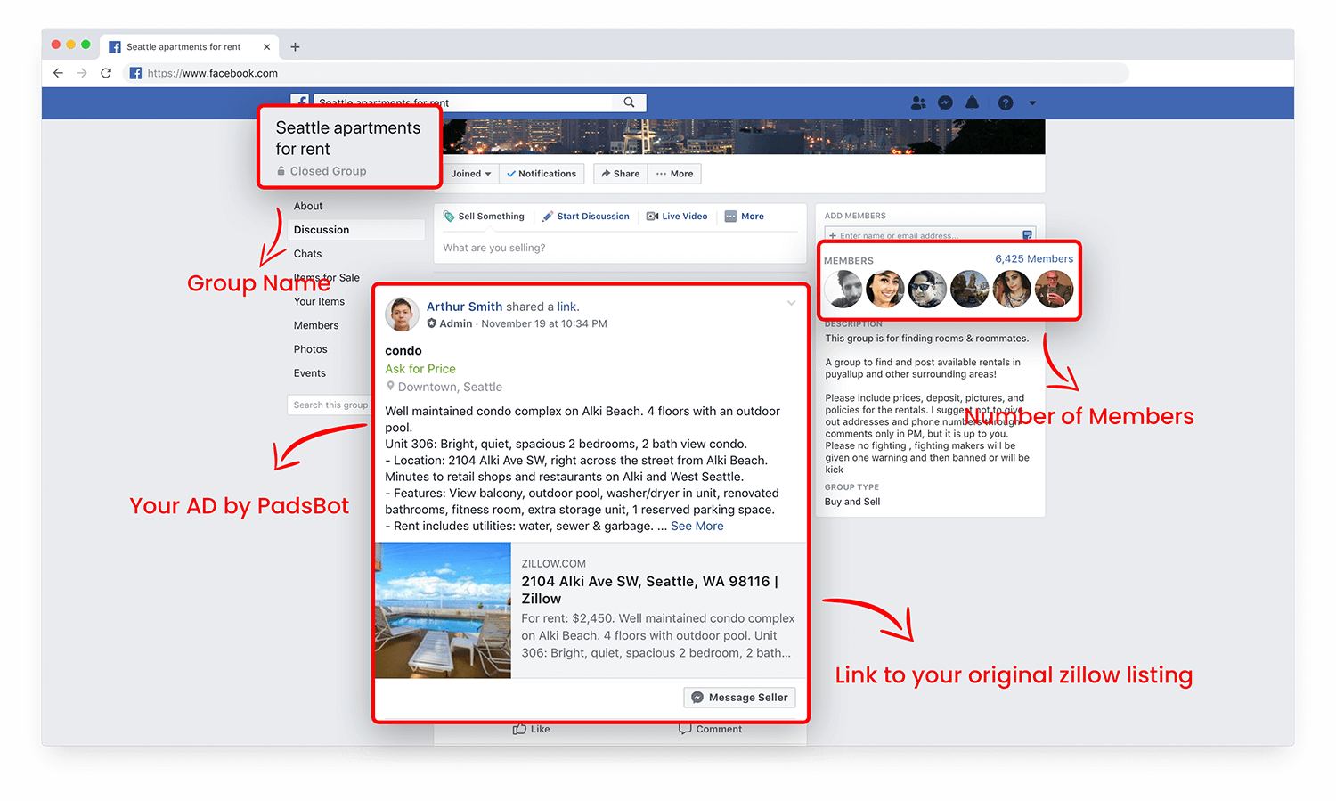 Reach thousands of users who search for their apartments on local facebook groups.